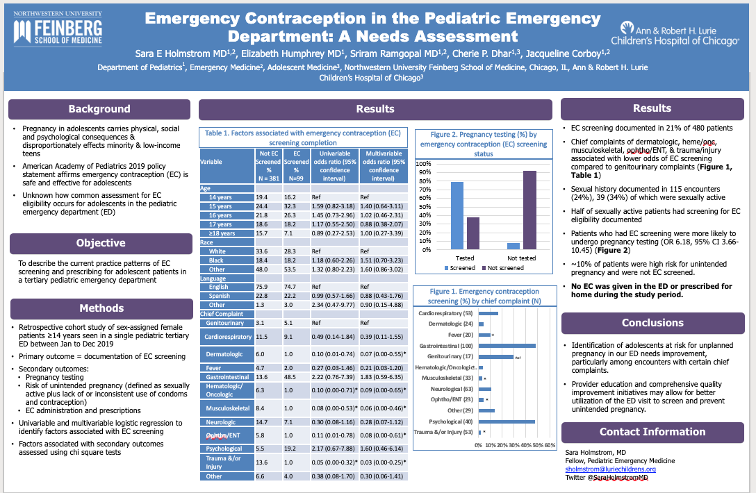 During my residency training, I collaborated with Dr. Sara Holmstrom on a needs assessment analyzing the quality of sexual healthcare for the adolescent population at Lurie Children’s. We found that our providers needed education and guidance on best practices for adolescent care. We used the results from the needs assessment to create an algorithm for sexual health in the pediatric emergency room. This algorithm is currently in place at Lurie Children’s Hospital and is used for provider education and patient care.